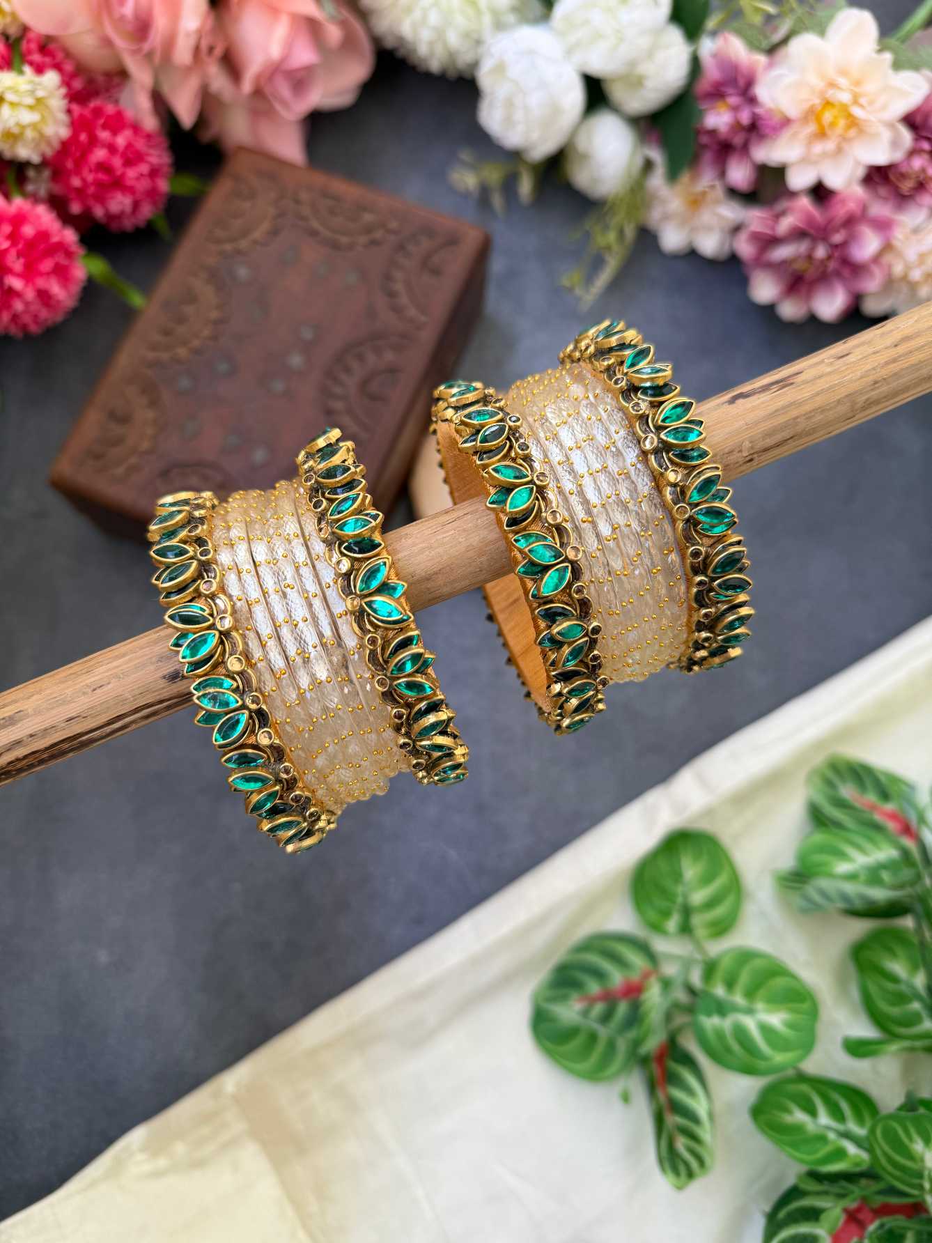 Lotus Teal Green bangles with Off White Glass Bangles – BC538